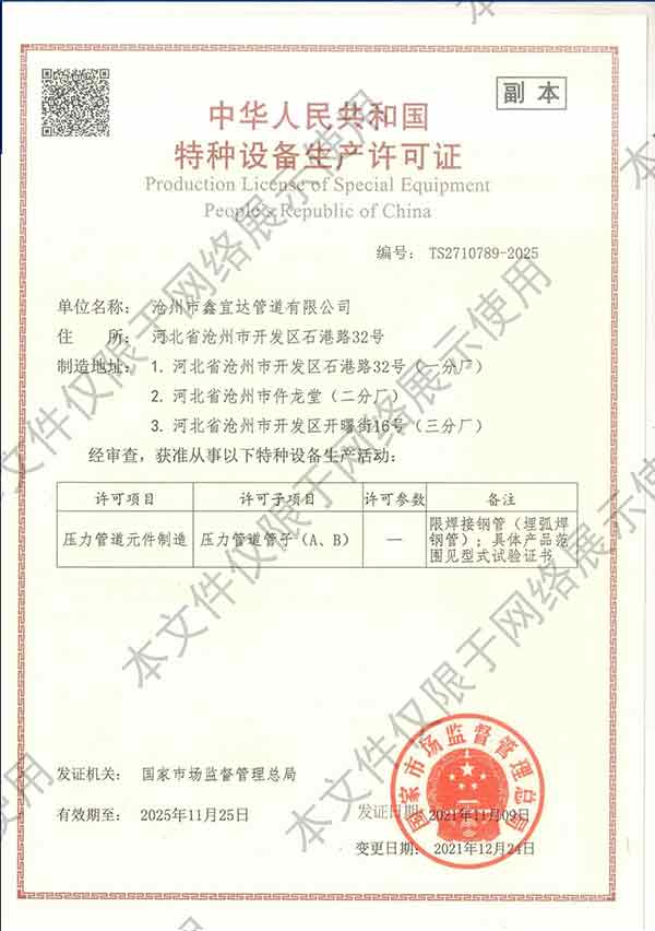 滄州市鑫宜達管道有限公司成立于2003年7月,坐落于滄州經濟開發(fā)區(qū),占地面積40萬平方米,注冊資金1.81億元,是集螺旋鋼管生產、防腐加工以及無縫鋼管、卷板、帶鋼等品類鋼材經營銷售于一體的工貿型企業(yè)。公司現有員工400多人,其中,中高級技術職稱的人員達120余名。 滄州市鑫宜達管道有限公司擁有9條螺旋鋼管生產線和3PE防腐生產線,可生產直徑219--3640mm,壁厚5.5--28mm,最高鋼級X100的各種規(guī)格防腐螺旋鋼管...